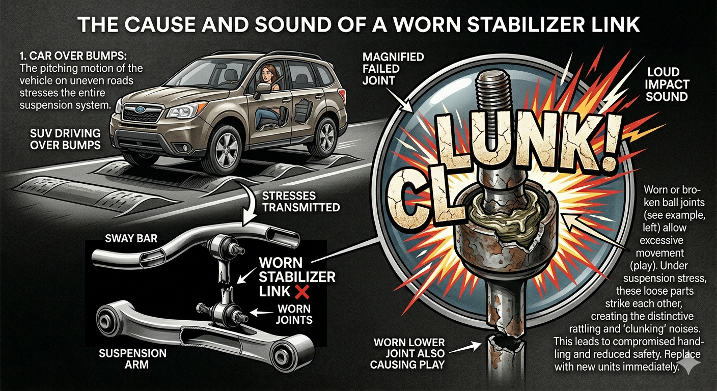 While the loud clunk is usually triggered by major bumps, if the stabilizer link ball joints are completely worn and dry, they can make a continuous, high-frequency rattle even when driving on what seems like a standard, smooth road surface. This indicates advanced failure.
