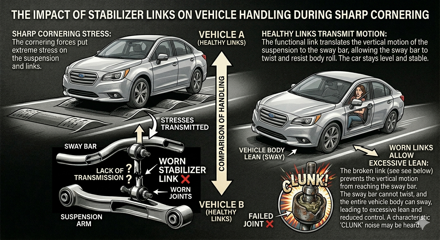 Since the link’s job is to keep your car level, its failure removes the necessary resistance against the centrifugal force that pushes the car’s body outward during a turn.